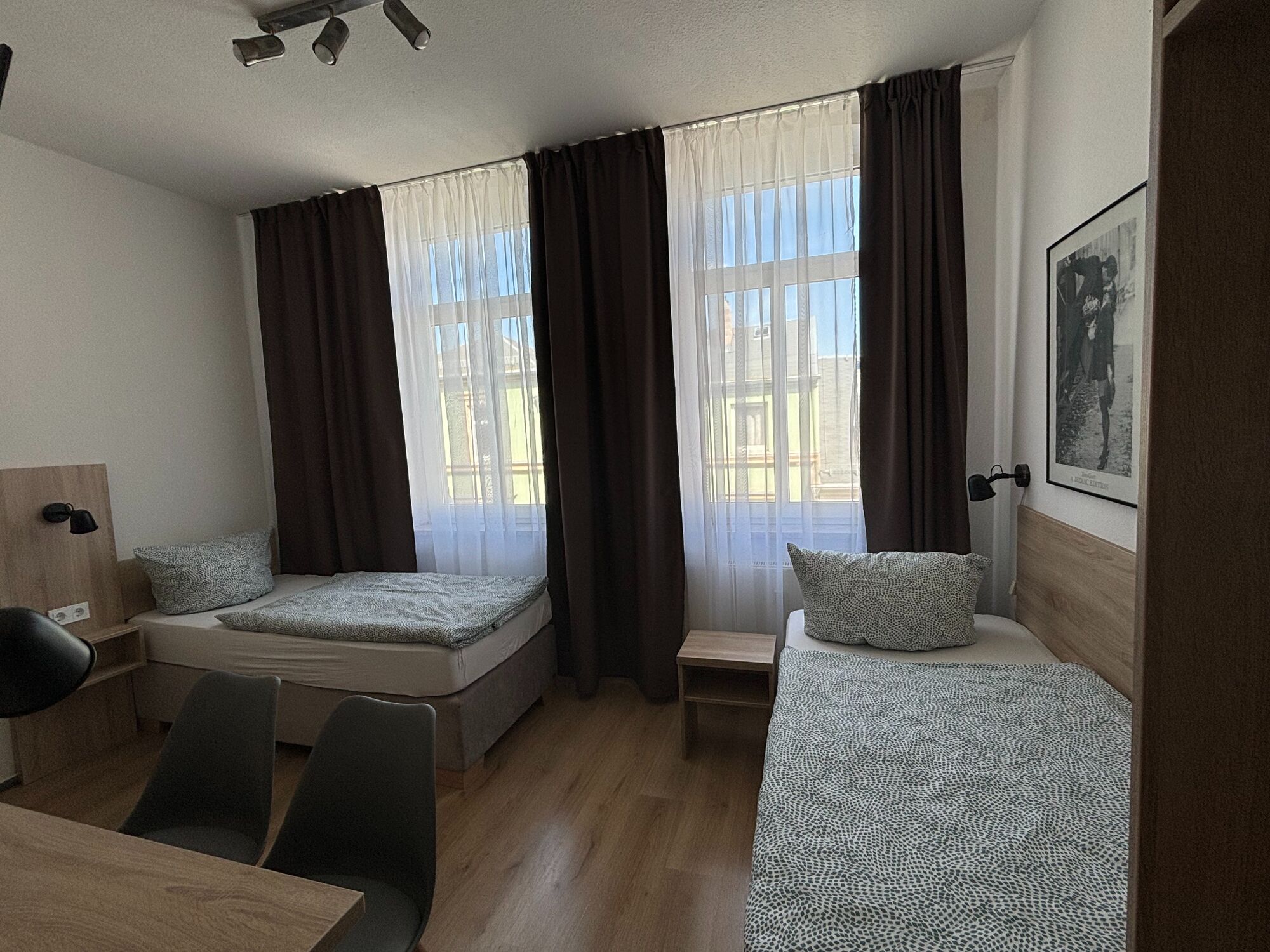 Komfortables Zimmer mit zwei Einzelbetten und eigenem Bad. Keine Küchenzeile im Zimmer, aber Zugang zur voll ausgestatteten Gemeinschaftsküche. Perfekt für preisbewusste Gäste. WLAN und Smart-TV inklusive.