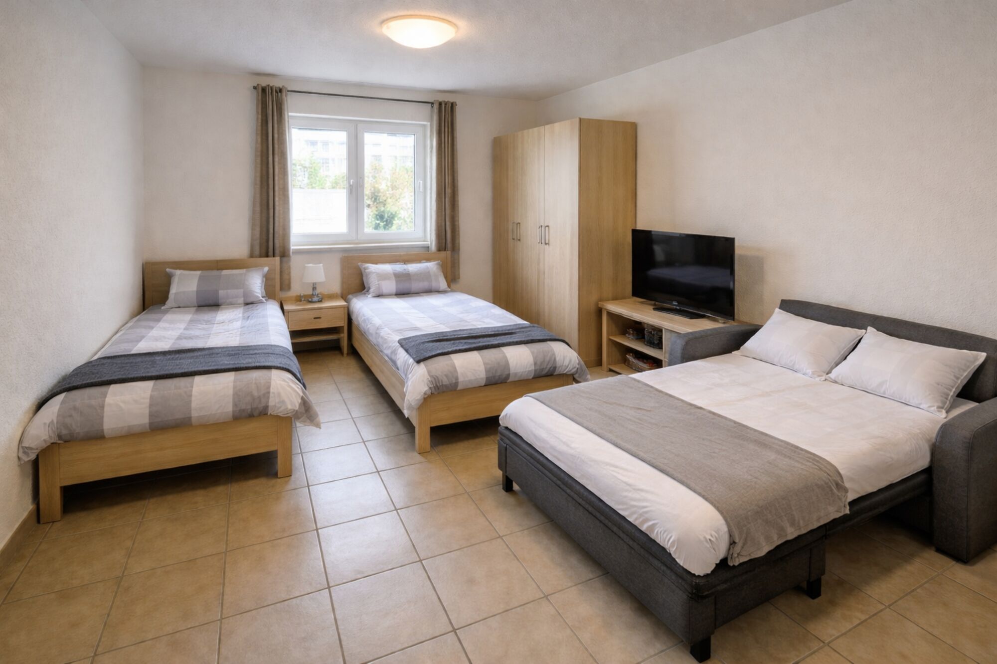 Bequeme Betten mit frischer Bettwäsche, geräumige Kleiderschränke für persönlichen Stauraum – teilweise abschließbar (auf Wunsch mit Safe), TV mit internationalen Programmen, Tische und Sitzgelegenheiten zum Arbeiten oder Entspannen, kostenfreies WLAN im gesamten Haus.