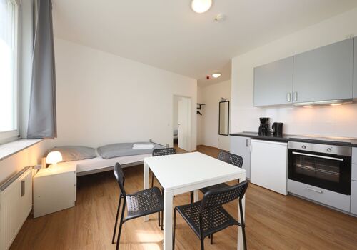 Alle Zimmer mit Tisch, Stühle, Kühlschrank, Wasserkocher und auf Anfrage mit Mikrowelle.