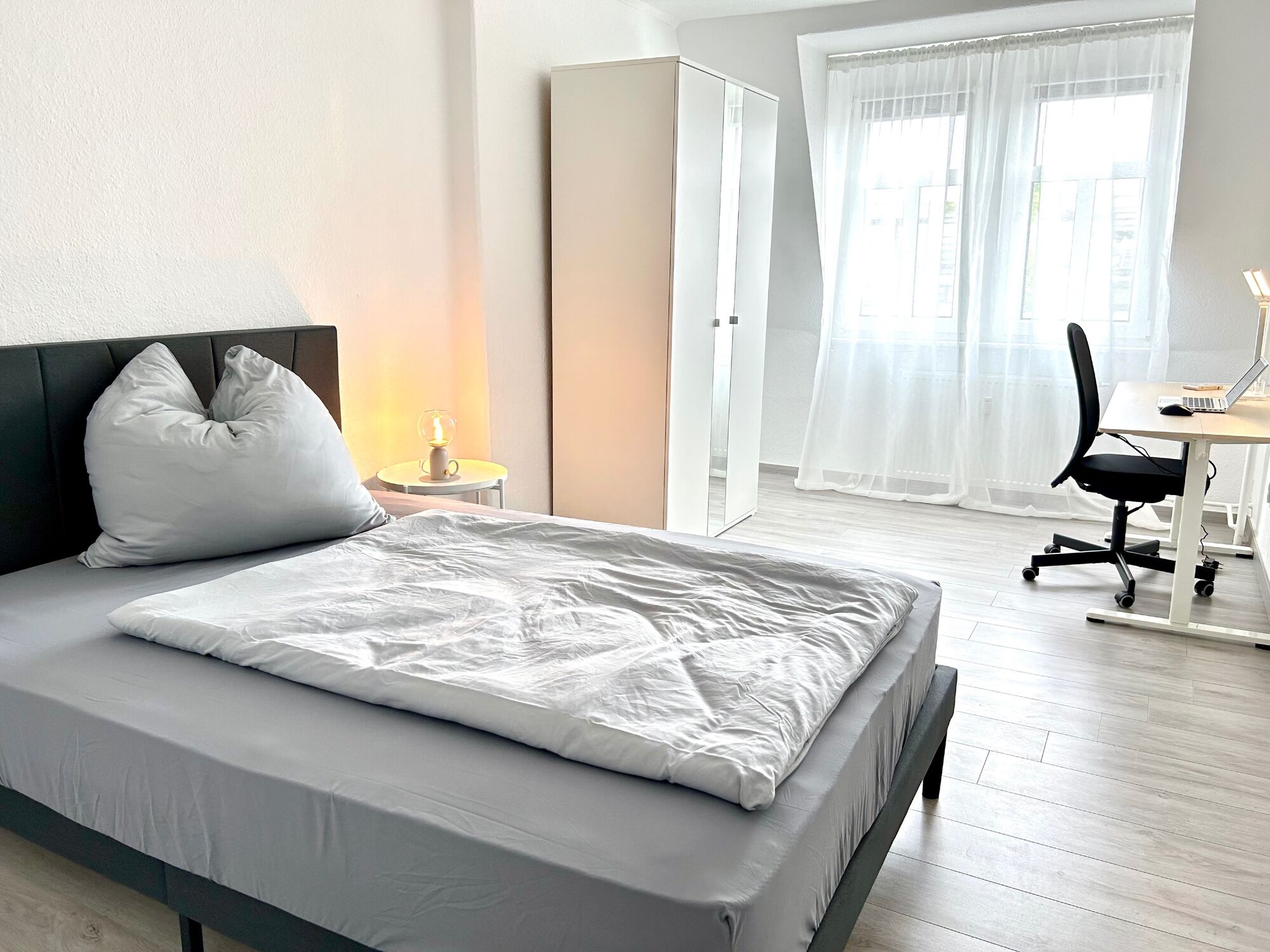 Die Wohnung verfügt über drei separate Schlafzimmer mit jeweils einem 140×200 cm Bett und eigenem Schreibtisch, sodass jeder seinen festen Rückzugsort hat. Ein Gemeinschaftsraum lädt zum gemeinsamen Essen oder entspannten Feierabend ein. Die ausgestattete Küche sowie eine Waschmaschine sorgen für einen unkomplizierten Alltag auch bei längeren Aufenthalten.