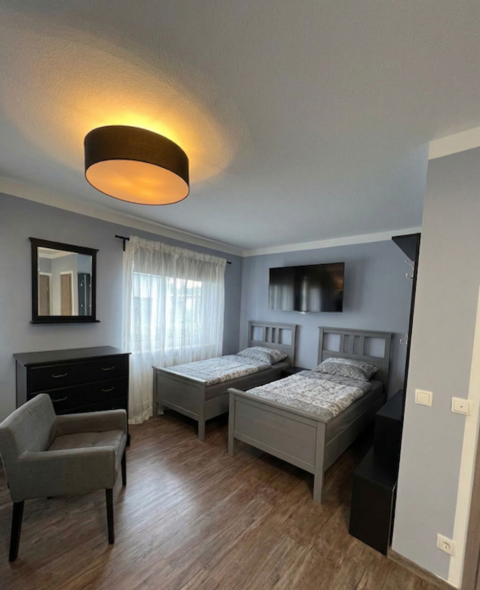 Schlafkomfort: Das Zimmer verfügt über zwei separate Einzelbetten (ideal für Kollegen), einen großen Smart-TV für den Feierabend und ausreichend Stauraum in Kommoden.